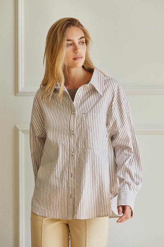 Oversized Striped Button-Down Shirt - Mocha