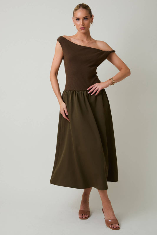 Twist Detail Boatneck Mixed Media Dress in Deep Olive