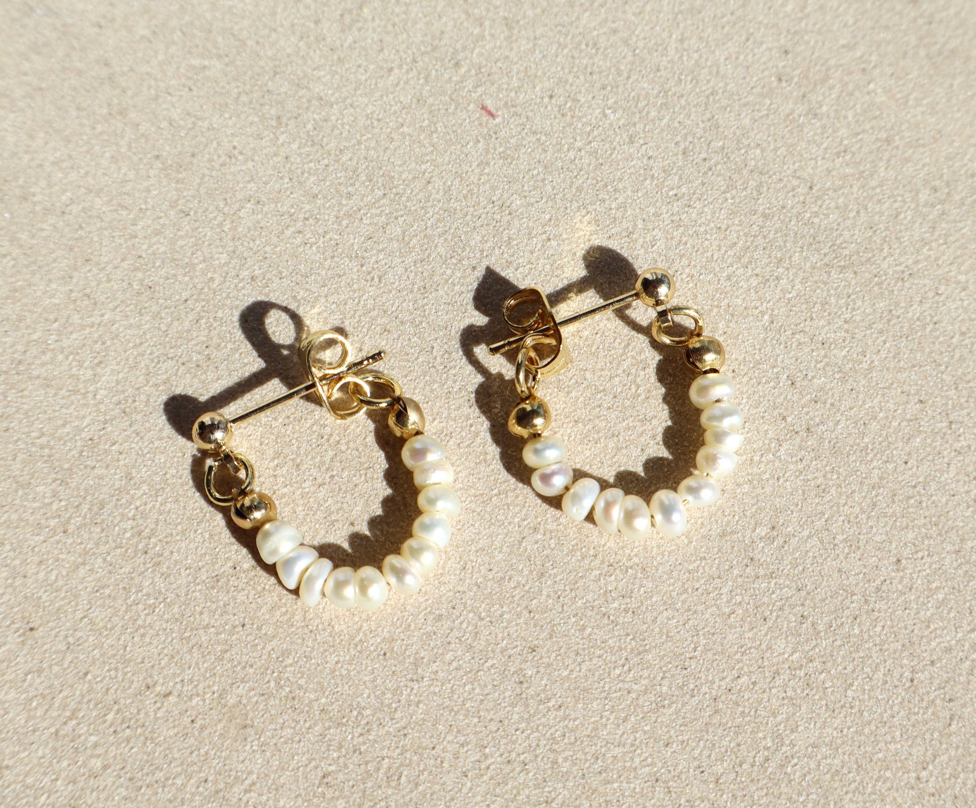 A dainty twist on an everyday staple, these huggies feature petite genuine freshwater pearls on 14K gold-filled posts, offering a soft, minimalist look that layers beautifully or stands effortlessly on its own. Crafted with high-quality, hypoallergenic materials that are lead-free, nickel-free, and non-tarnish, ideal for customers with sensitive skin and for long-term wear.