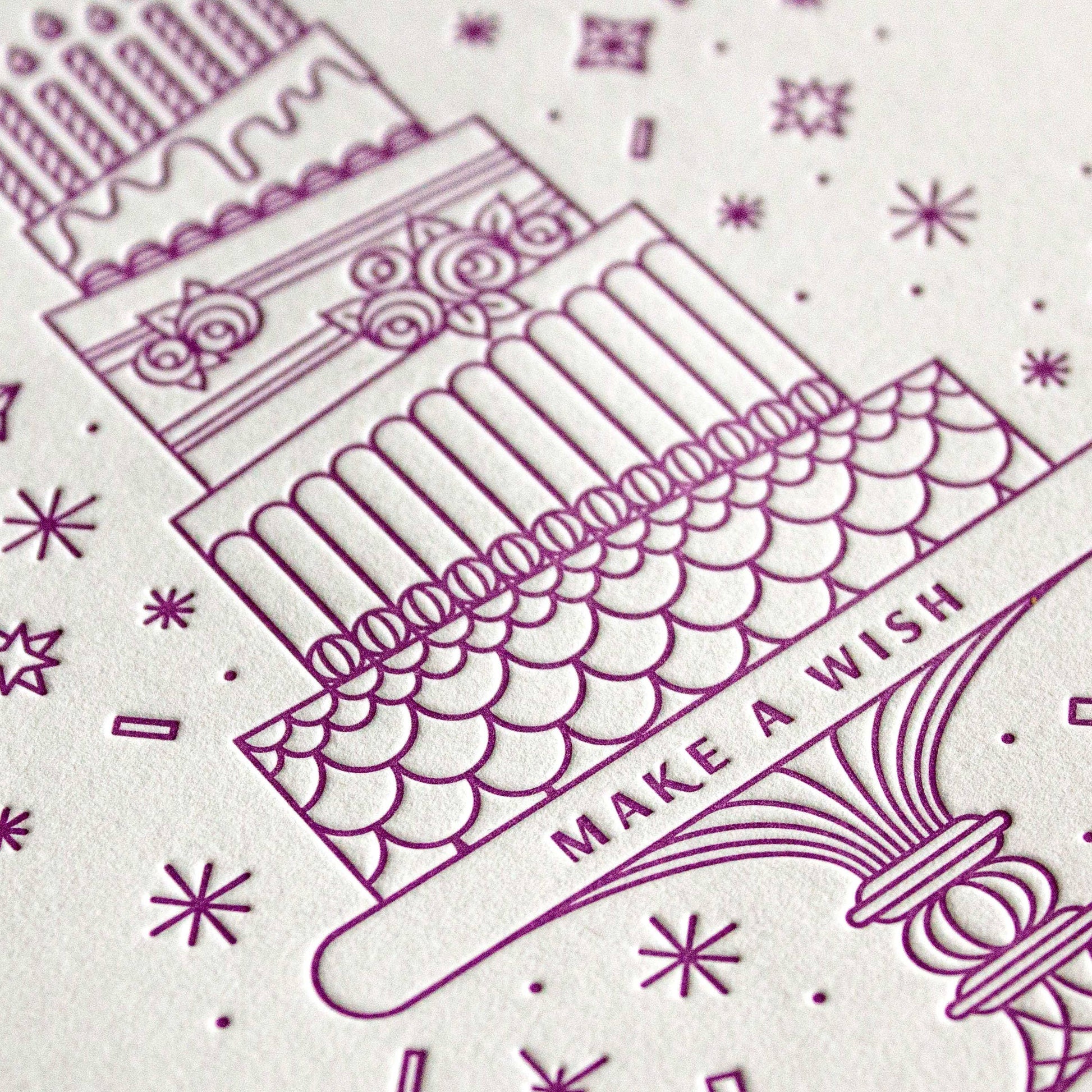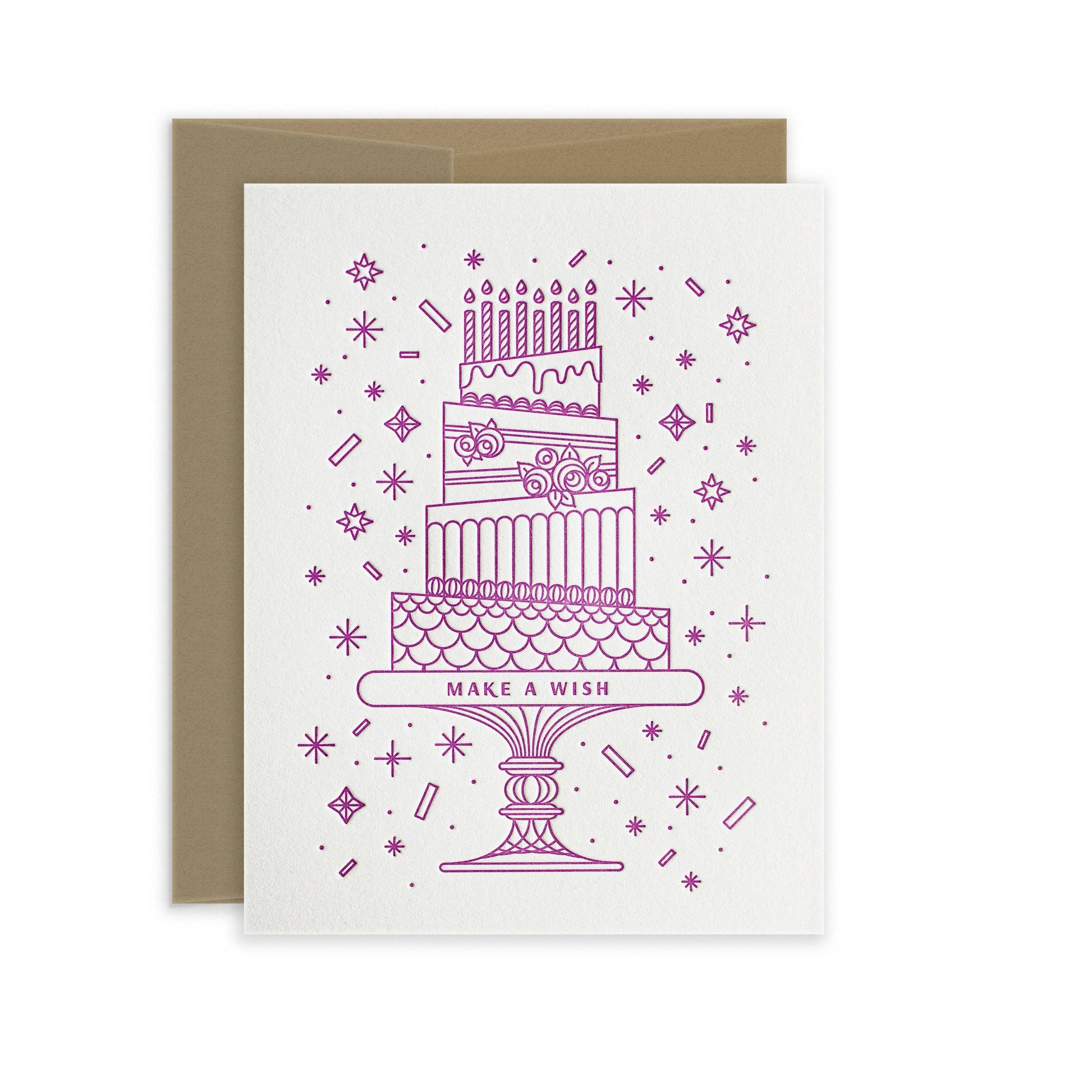 This letterpress card features a modern illustration of a towering layer cake and plenty of confetti. It'll bring the razzle dazzle to your next birthday party!