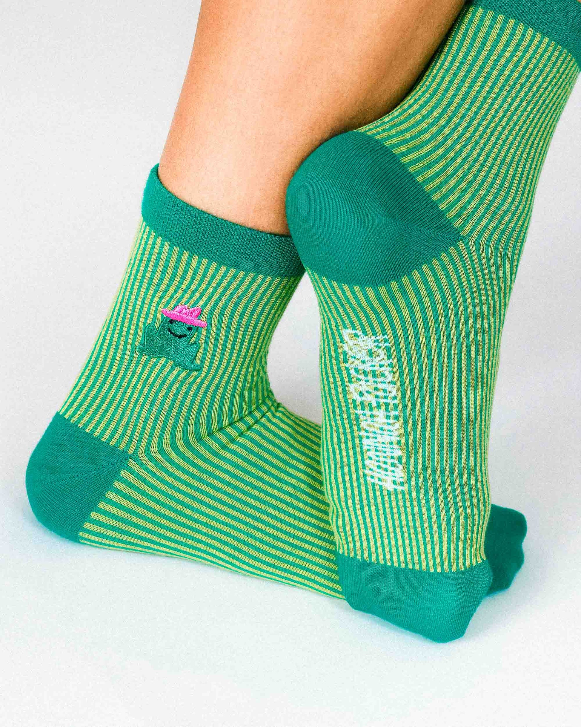 These whimsical striped socks are hiding a little surprise - an embroidered frog wearing a cowboy hat on the side! Part of an artist collaboration with Hannah Packer.
