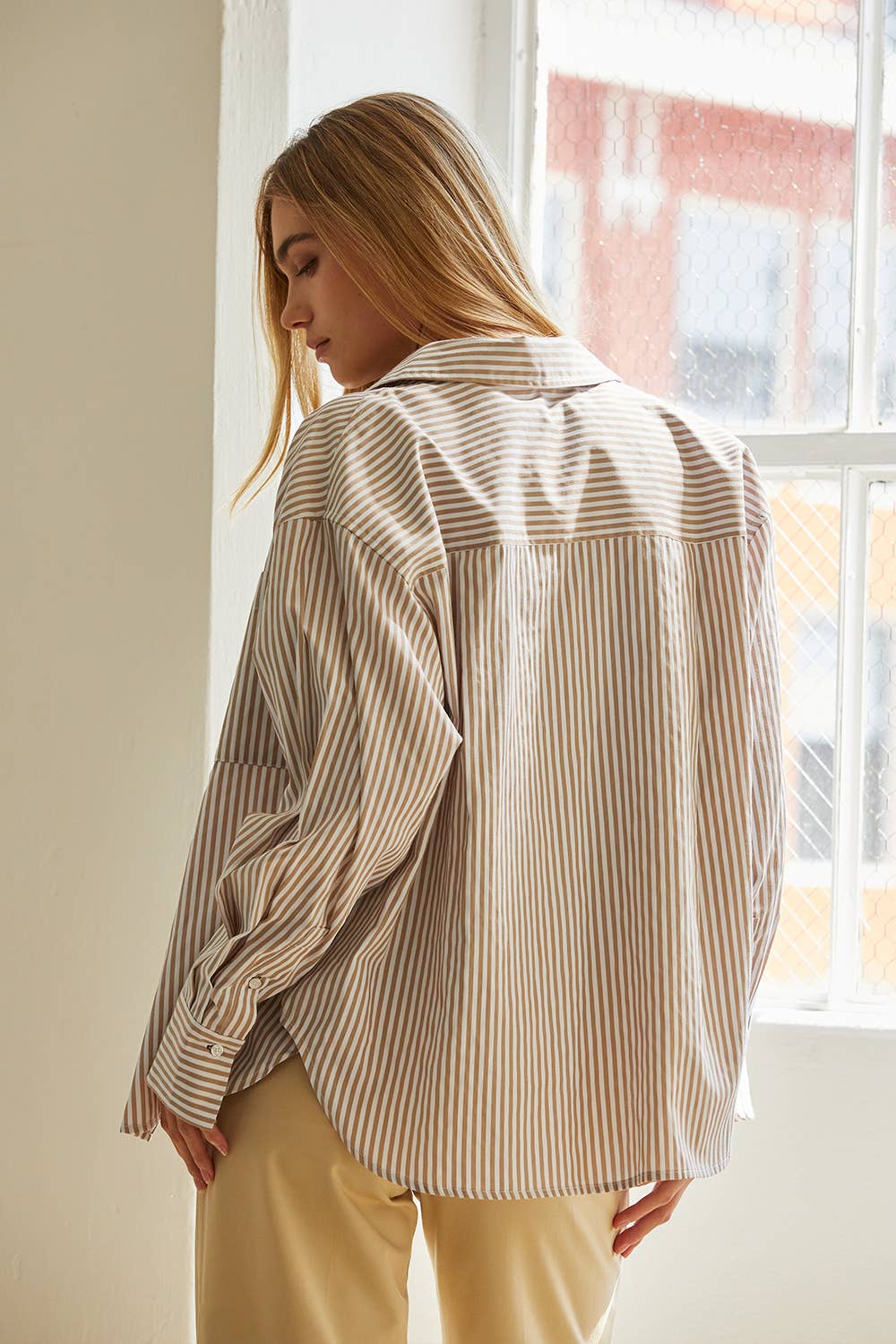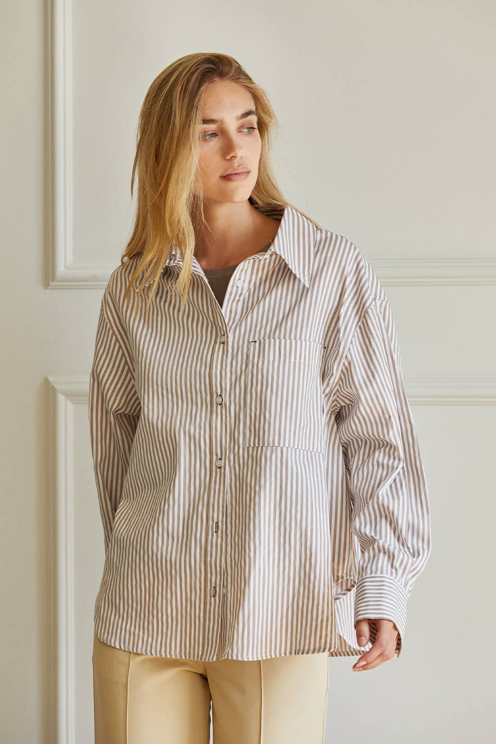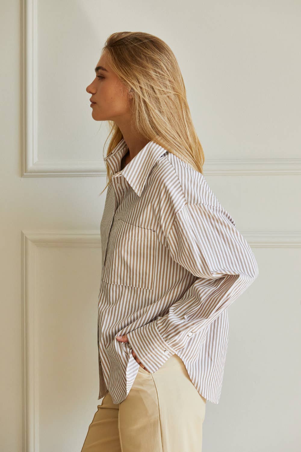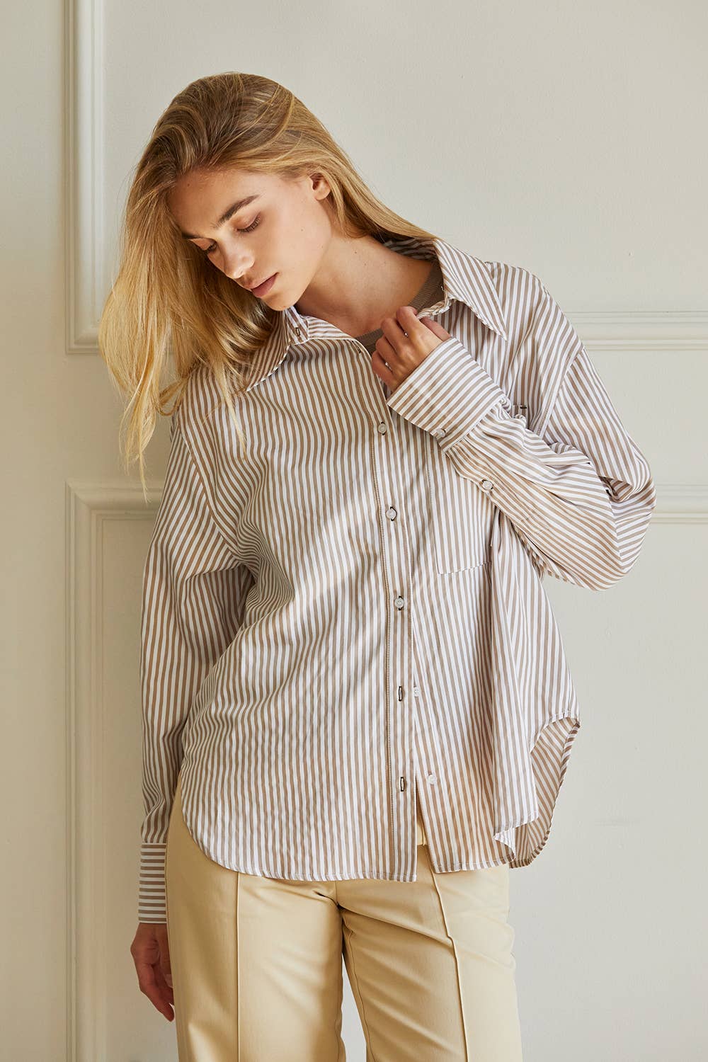 Classic but clean East Coast style is in for summer! This crisp button-down makes the perfect top layer for your outfits and swimwear, and in soft beige and white, it goes with everything. --Gigi