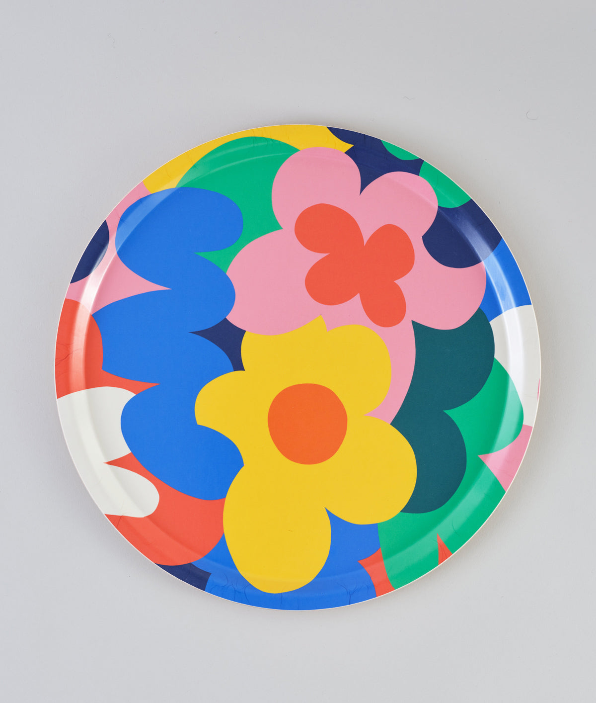 Big bold blooms adorn this bright and vibrant circular art tray.