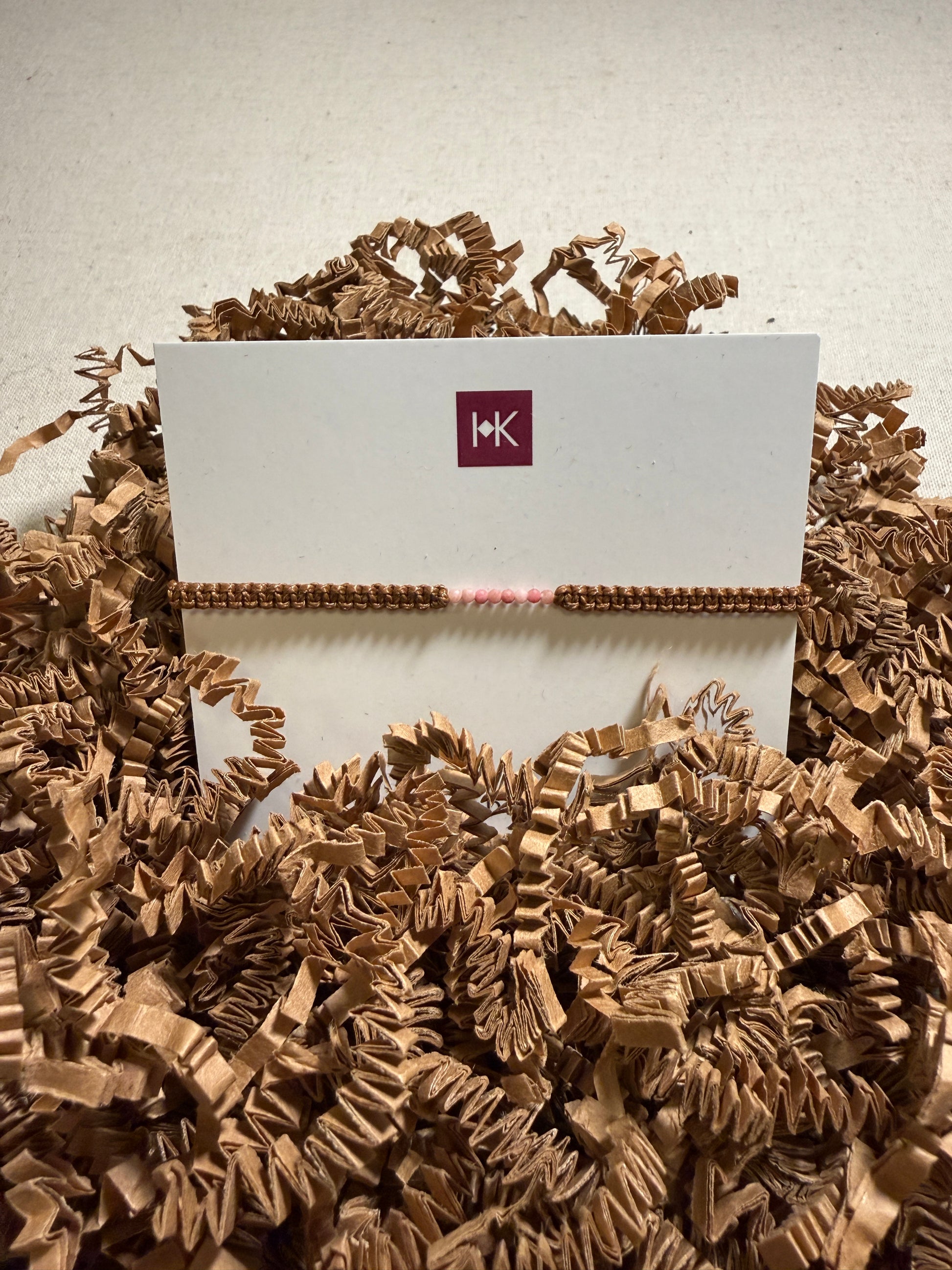 Comes on pretty, Hadeel K-brand card. Adjustable sliding closure.