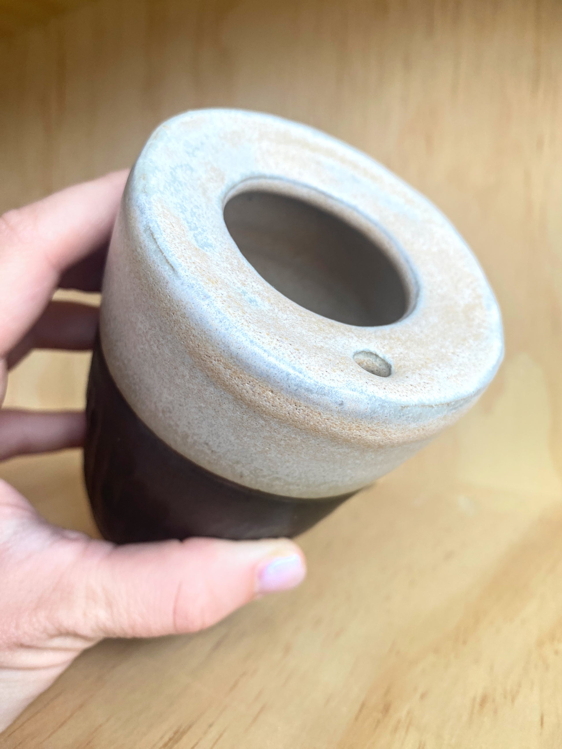 This ingeniously-designed ceramic tumbler solves the age-old problem of how to take your beverage on the go without sacrificing handcrafted style! The wide lip around the top prevents spills, while the dual holes let you easily fill, sip, and clean the cup.