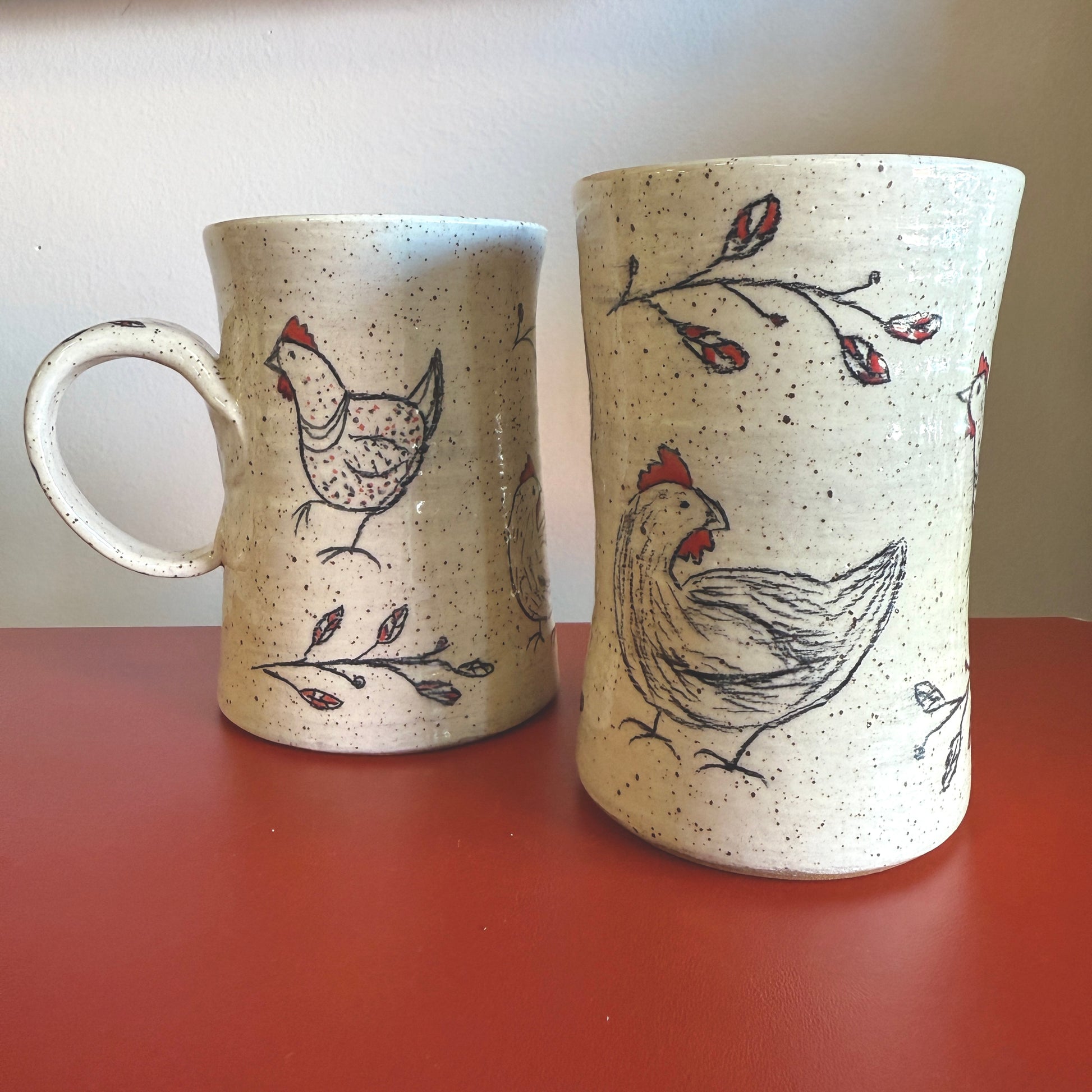 Beth has glazed this cup with a creamy speckled ivory all over and then drawn adorable little chickens and branches in black underglaze pencil, topped off with pops of red. Perfect for the chicken lover in your life.