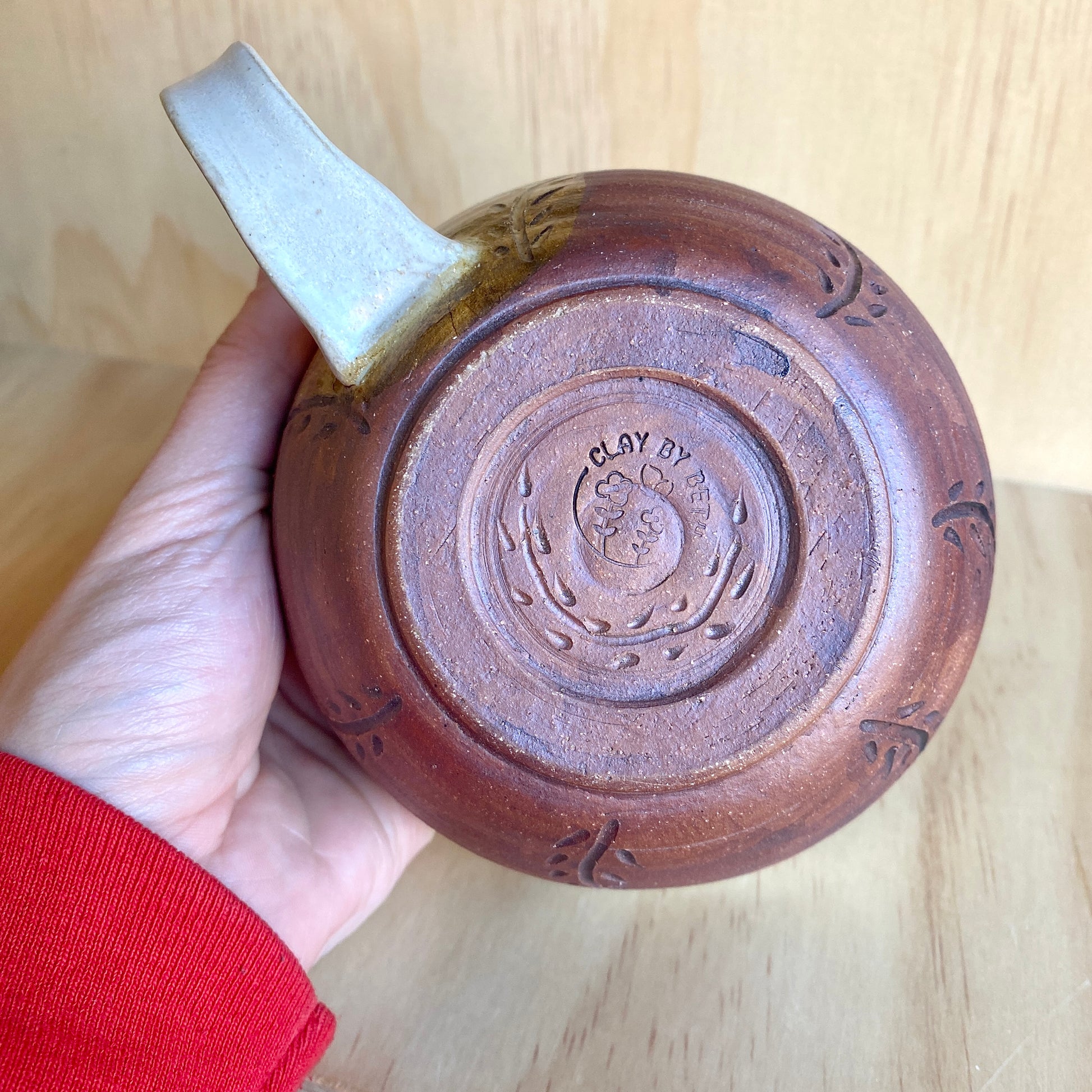 This two-tone, hand-thrown mug is decorated with iron oxide, an age-old glazing technique that gives a lovely rust-color matte finish. Paired with a creamy off-white glaze and a carved leaf motif, this generously-sized mug is perfect for wrapping your hands around a steaming drink and finding a moment of peace.