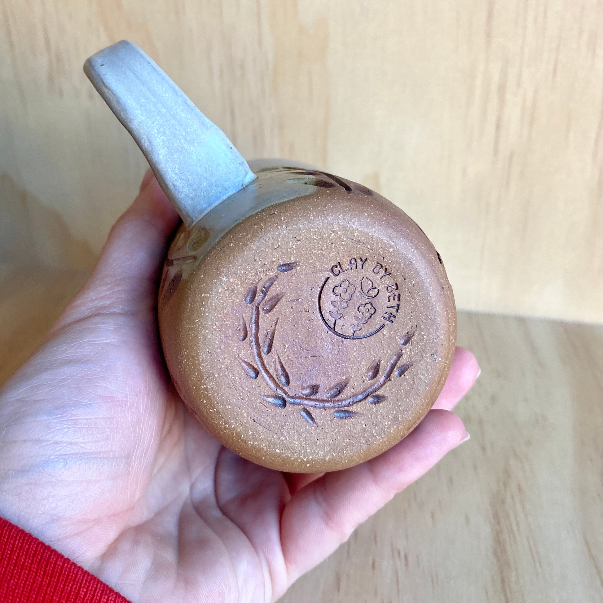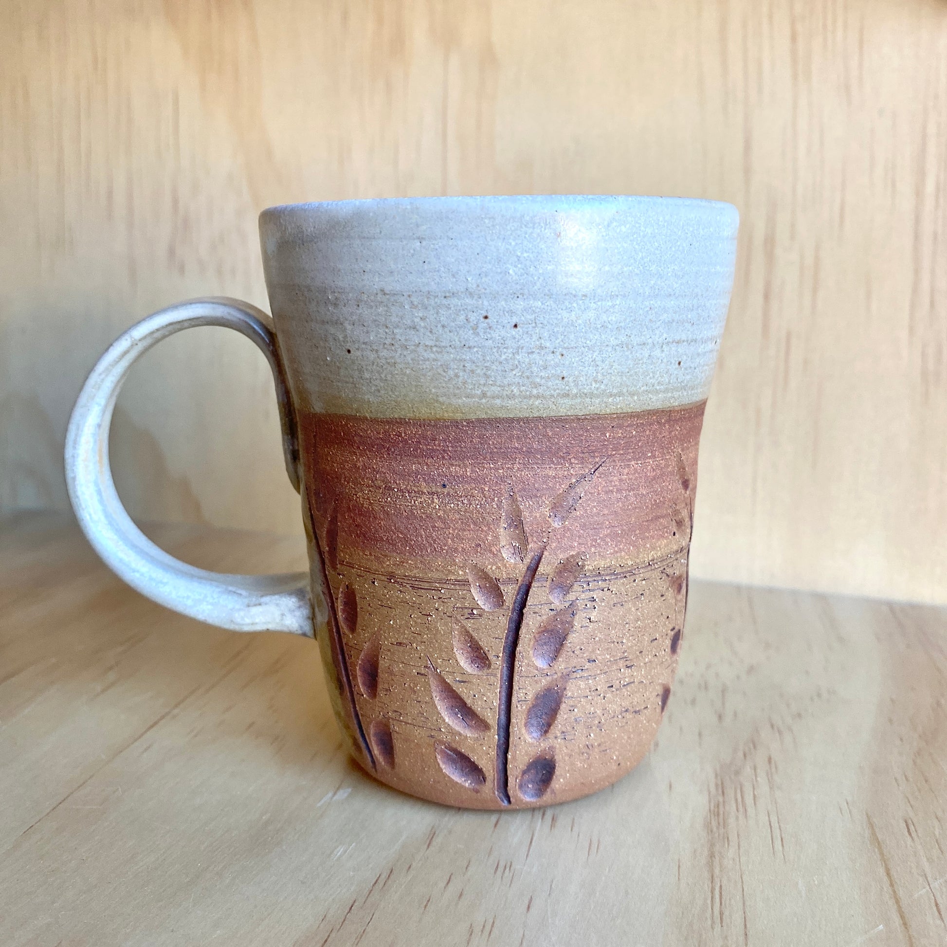 These two-tone, hand-thrown mugs are decorated with iron oxide, an age-old glazing technique that gives a lovely rust-color matte finish. Paired with a creamy off-white glaze and a carved leaf motif, these mugs are perfect for rooting yourself in nature as you sip your favorite drink!