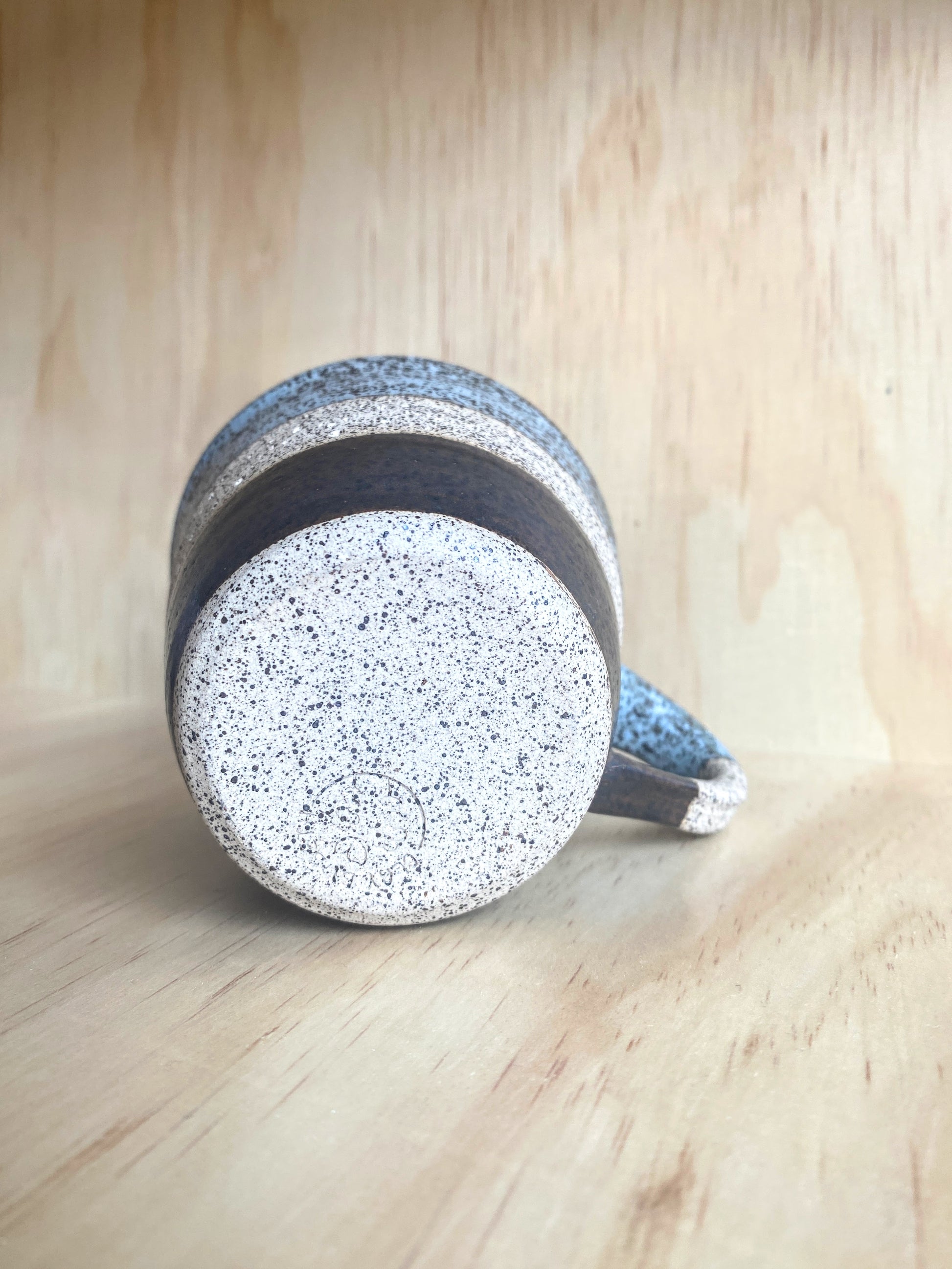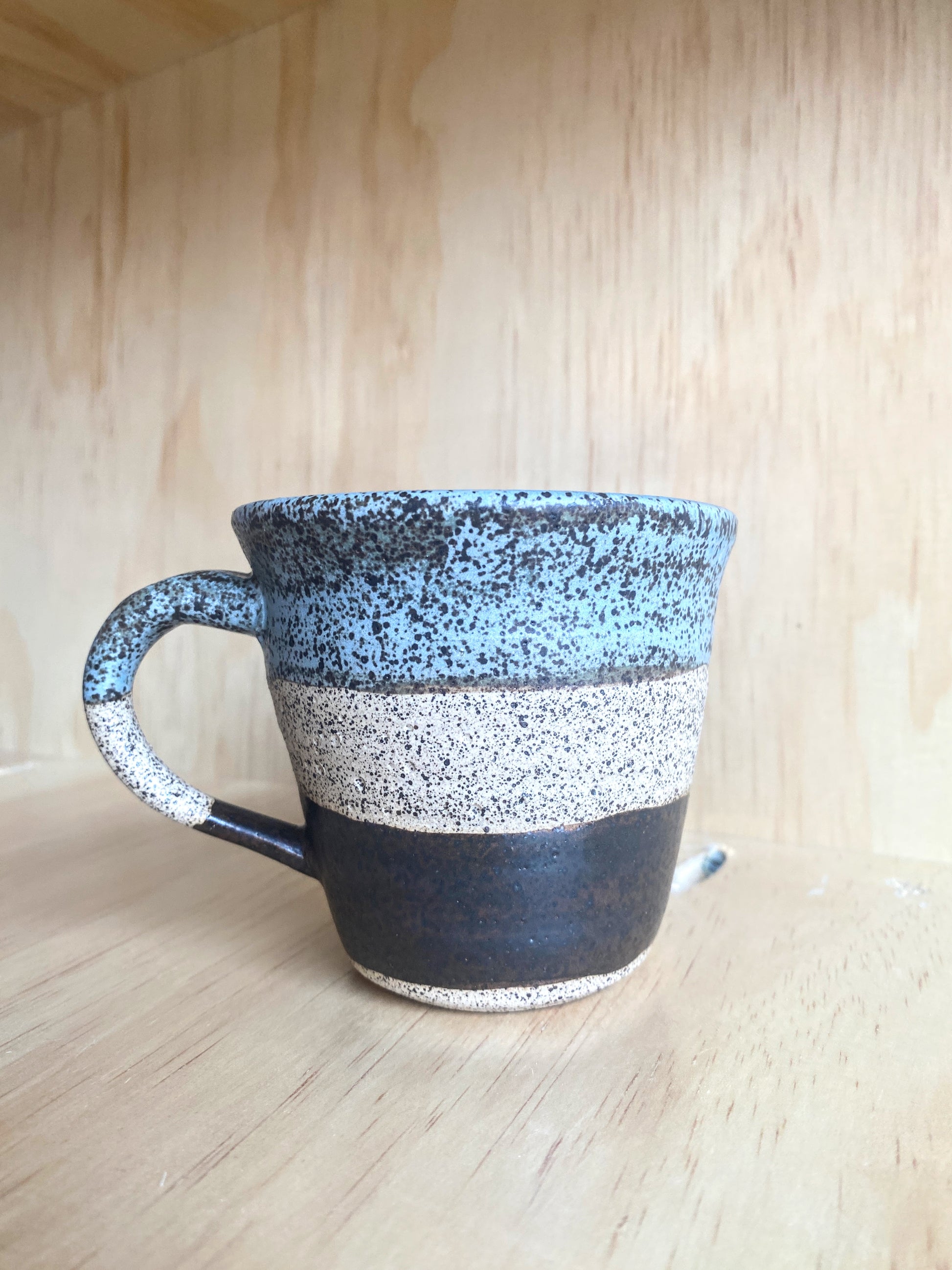 This hand-thrown mug made out of an earthy speckled clay features wide stripes in three different glazes.