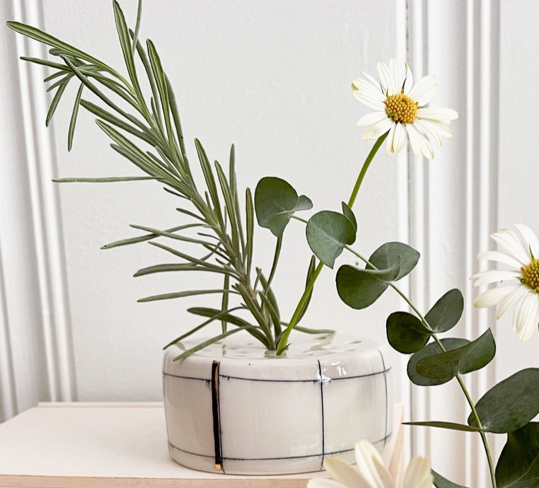 Minimal in design, maximal in style. These Floral Frogs that are water-tight and have enough weight to counter balance any arrangement, whether it be a few simple stems or an ikebana masterpiece. Each is hand thrown on the potters wheel and features hand drawn inlay and 22k gold accents.