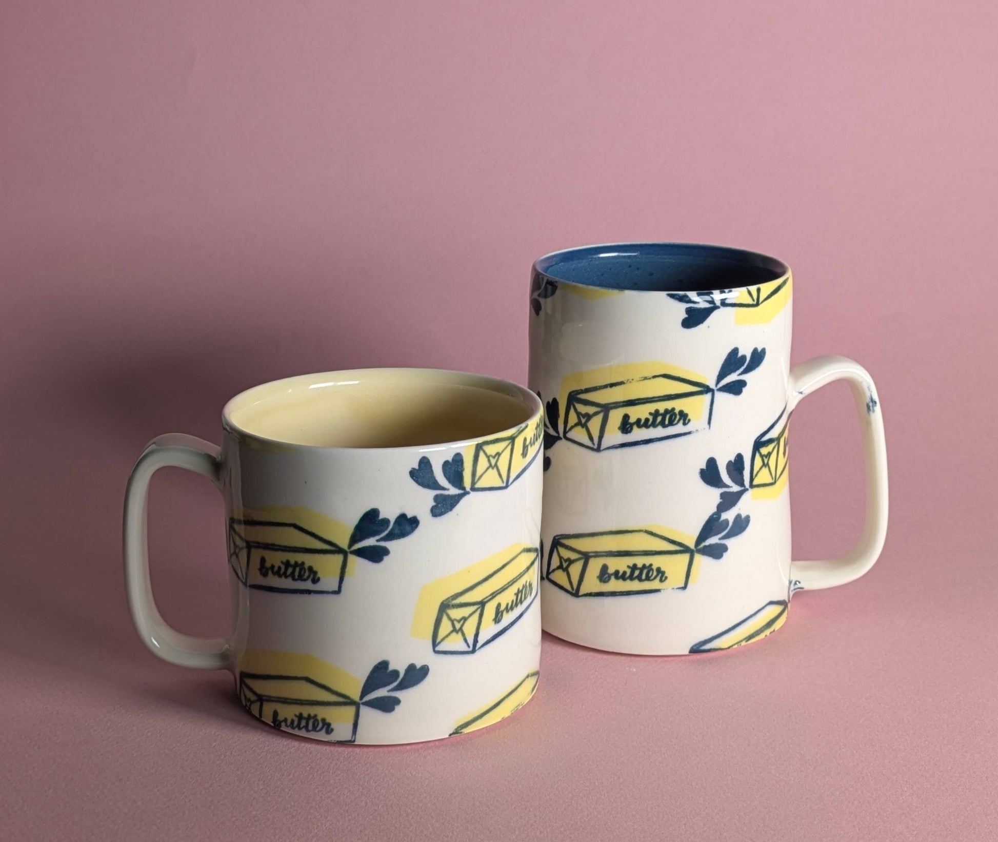 Handmade ceramic butter mug - screen printed with a hand drawn stick of butter accented with hearts. Available in two glaze options - butter yellow or navy blue! Two sizes are available: Small (approx. 3.25" tall & holds 10-12 oz.), Medium (approx. 4" tall, holds 14-16 oz.) Microwave & dishwasher safe :) p.s. due to the nature of handmade ceramics and issues in the ceramic supply chain, there may be slight variations in size, color and glaze consistency.