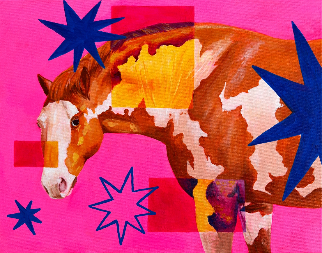 Audrey Chamberlin, aka @ponyupbyaudrey (IG) and @hothorsegir1 (TikTok), makes paintings for the "horse girl" in all of us - but these aren't your demure horse landscapes of yesteryear! Audrey's horses and foals frolic on candy-colored backgrounds with vibrant graphic adornments. They're bright, fun, and catching the eye of tastemakers who love a touch of camp (including the queen pink pony girl herself, Chappell Roan!)