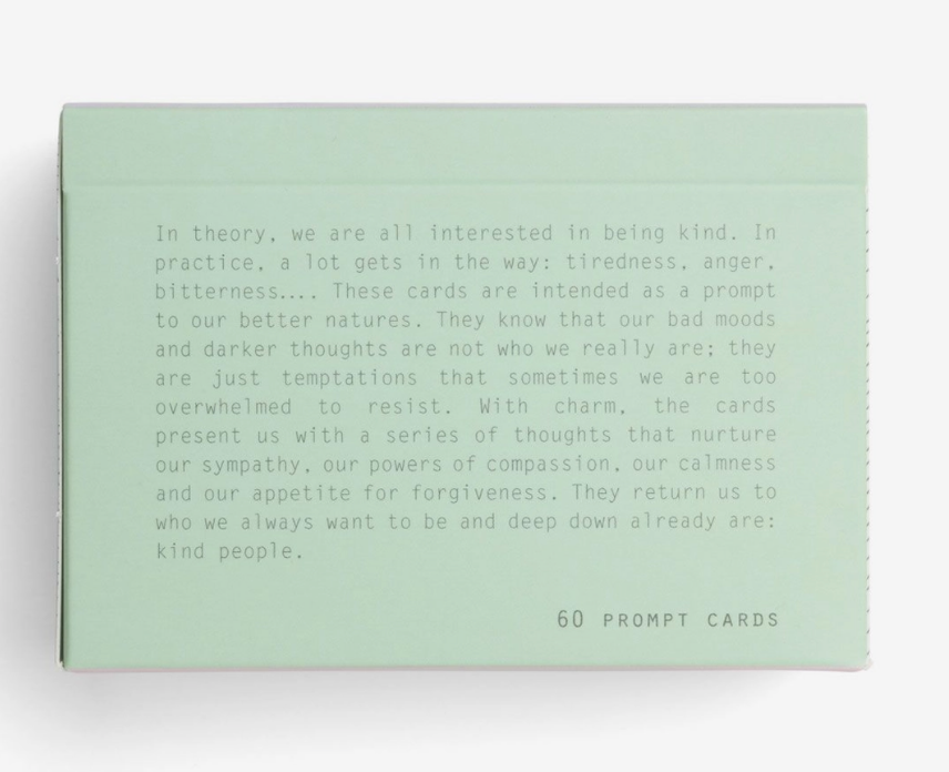 These Kindness Prompt Cards are designed to bring out our better natures. They present us with a series of thoughts that nurture our sympathy, our powers of compassion, and our appetite for forgiveness. They return us to who we always want to be and deep down already are: kind people.