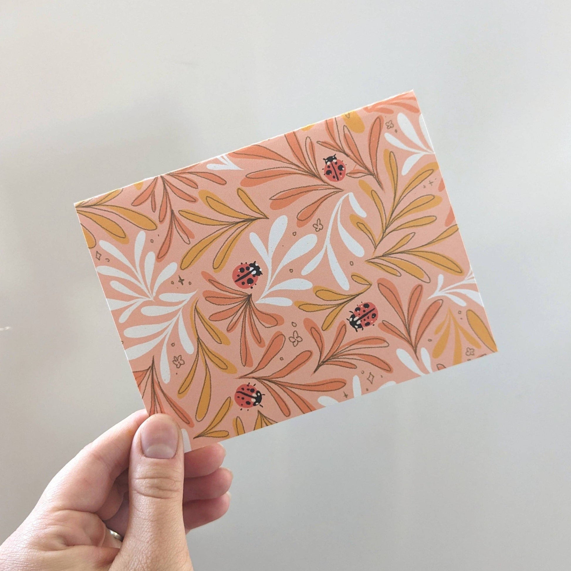 The perfect all-occasion notecard featuring hand drawn leaves with cute little ladybugs in bright springy colors.