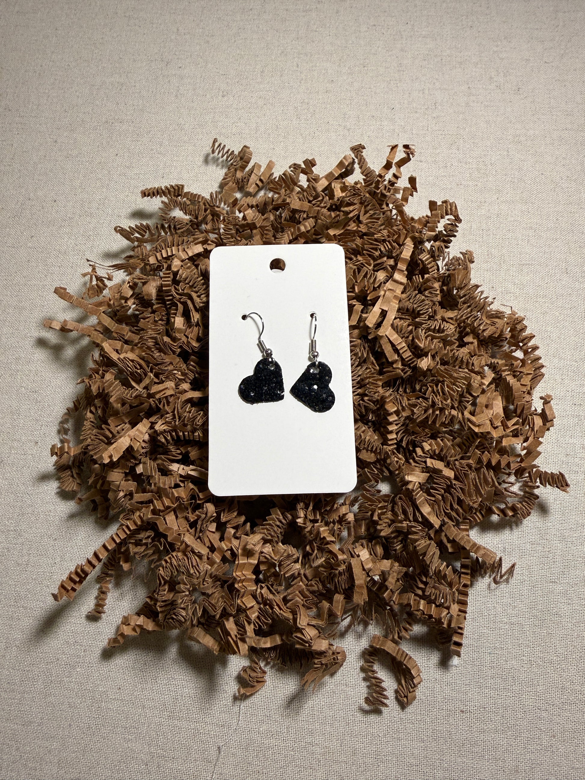 These heart earrings are hand-punched by Katie, a local jewelry artist. They come in a variety of materials including leather and cork.