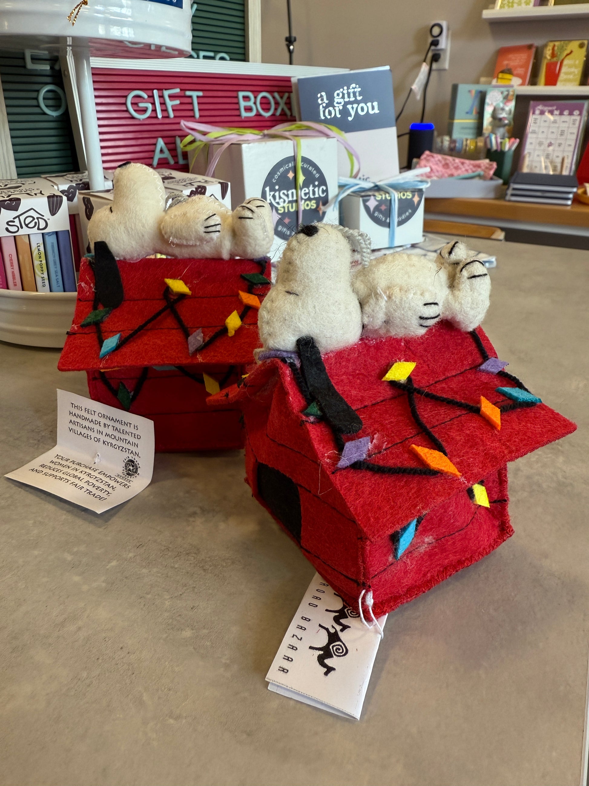This is a "seconds" sale -- these ornaments came to me in imperfect condition, with some visible glue spots where Snoopy's holiday lights are glued to his house and where Snoopy is glued to the top of the house. Some of the ornaments' felt house structures are a little crumpled. I've photographed the worst of the ornaments - they're this condition or slightly better.