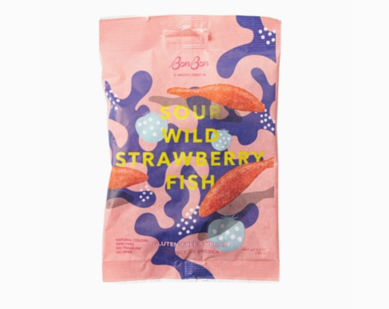 The Sour blackberry fish is a vegan, gluten-free, naturally colored and flavored sour candy made by a small factory in the south of Sweden.